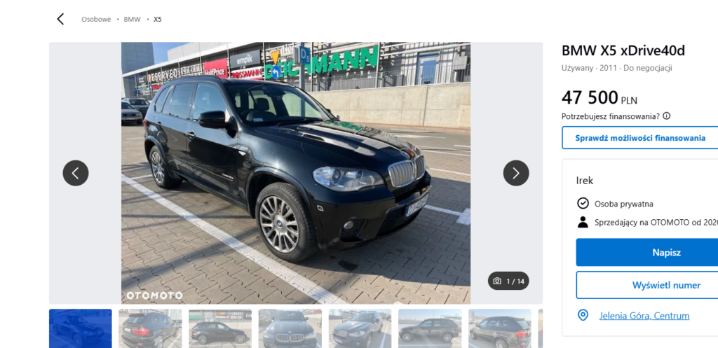 Zanim kupimy raport na CARFAX, musimy dysponować numerem VIN pojazdu. Na potrzeby tego artykułu, użyłem samochodu BMW X5 z 2011 roku z serwisu Otomoto. Auto jest powypadkowe oraz importowane z Anglii, dlatego tym bardziej chcę dowiedzieć się więcej na jego temat.