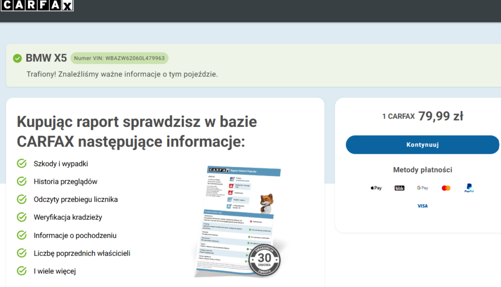 Postanowiłem bowiem zakupić przykładowy raport VIN na tej stronie i zobaczyć, jakie informacje można otrzymać.