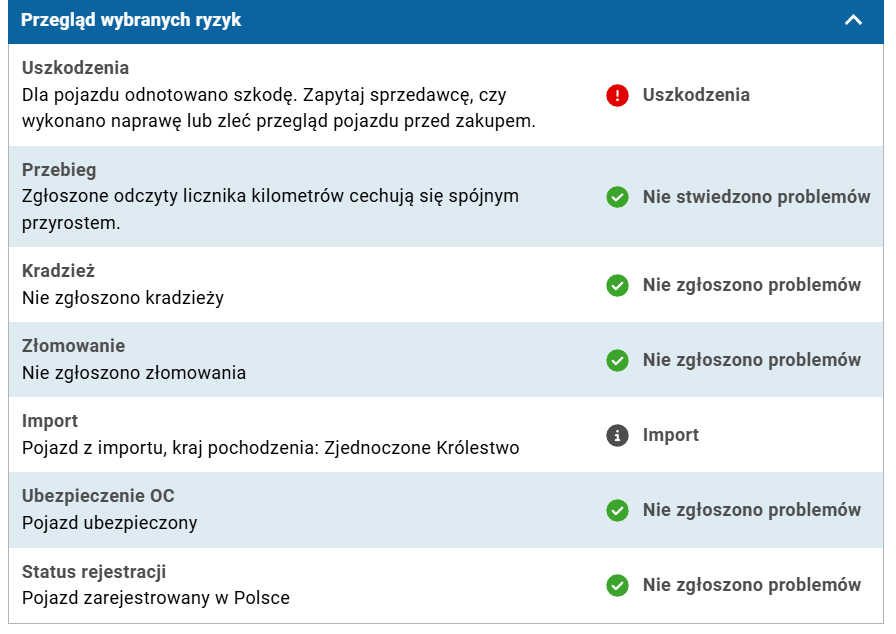 Na początku z raportu dowiemy się ogólnych informacji o pojeździe, takich jak rocznik, kolor, rodzaj paliwa, moc silnika, emisja CO2. Są to informacje ogólnodostępne. Oprócz tego, mamy podsumowanie tego, co znajdziemy dalej w raporcie.
