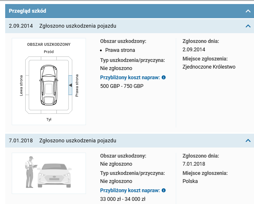 Dalej mamy przegląd szkód, czyli prawdopodobnie to, co interesuje nas najbardziej. Możemy dowiedzieć się, że pojazd był uszkodzony dwukrotnie- w 2014 i 2018 roku.