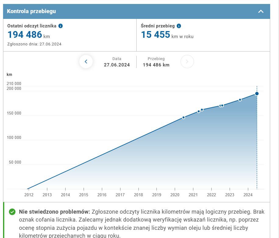 Następnie możemy zobaczyć odczyty z licznika. Nie wykryto tu nieprawidłowości. Odczyty są zaprezentowane na czytelnym wykresie, a także możemy zobaczyć średni roczny przebieg pojazdu, co jest rzadkością w dekoderach VIN. Oczywiście każdy może sobie to wyliczyć samodzielnie, jednak fajnie, że taka informacja się tu znalazła.