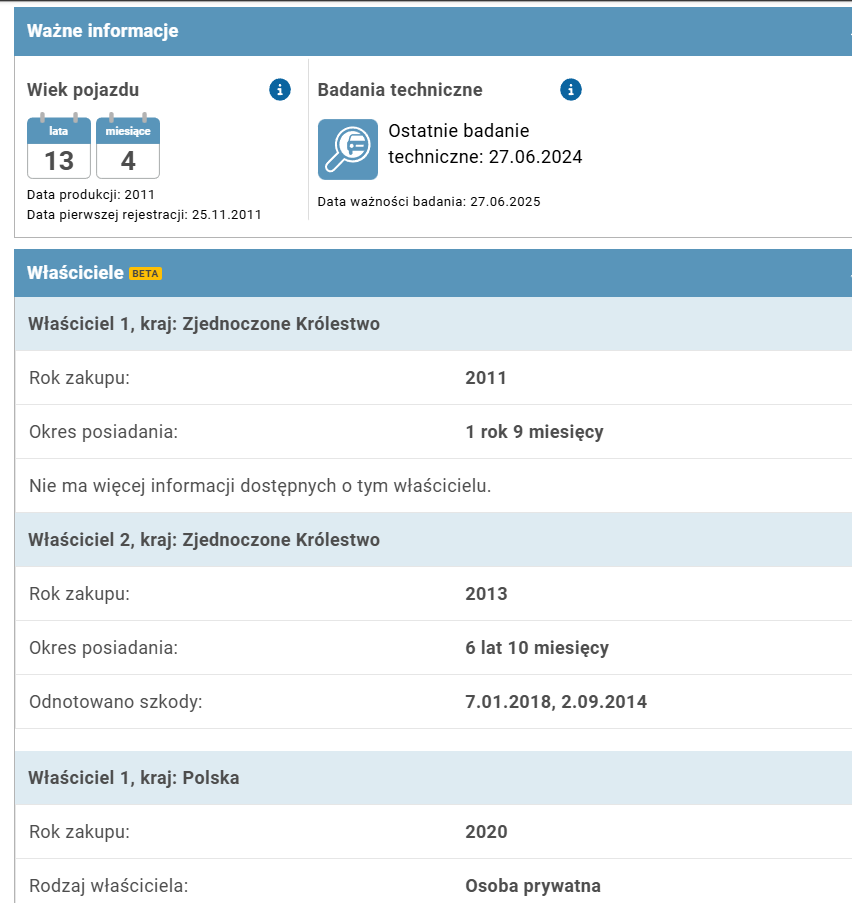 Nie wiem więc, czy jest to błąd CARFAX, czy samochód rzeczywiście był posiadany przez osobę z Anglii, a wypadek był w Polsce. Oba scenariusze są prawdopodobne, choć bardziej skłaniałbym się do tego, że jest to błąd CARFAX ze względu na to, że zakładka z informacjami o właścicielach jest w wersji BETA, czyli wersji testowej.