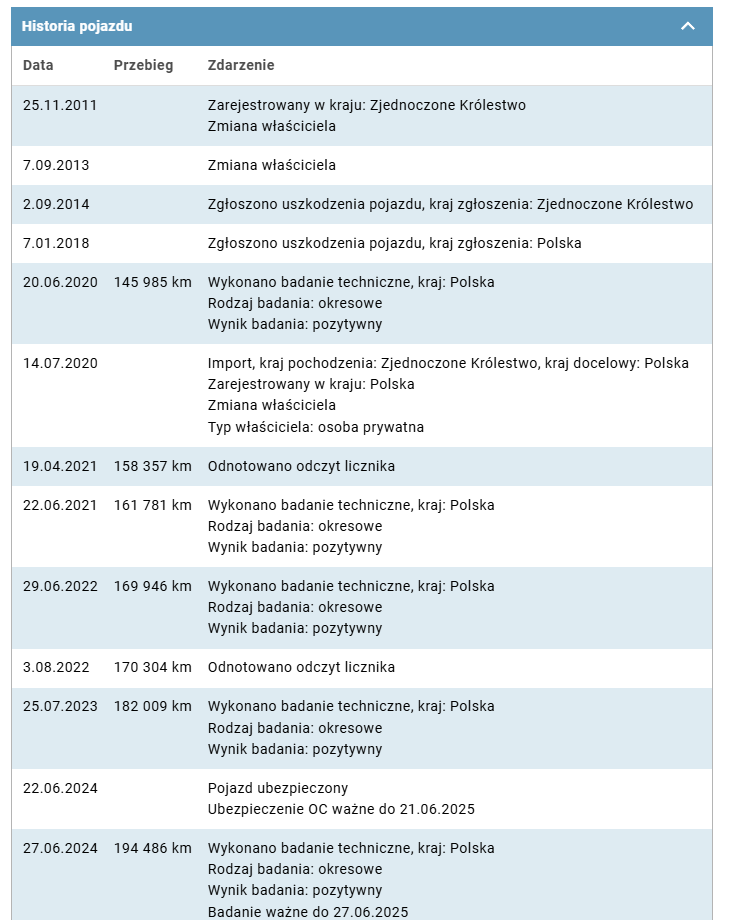 Pod koniec raportu mamy chronologiczną historię pojazdu, gdzie znajdziemy m.in. to, kiedy zmieniał się właściciel, kiedy robiono odczyty licznika, czy daty badań technicznych.