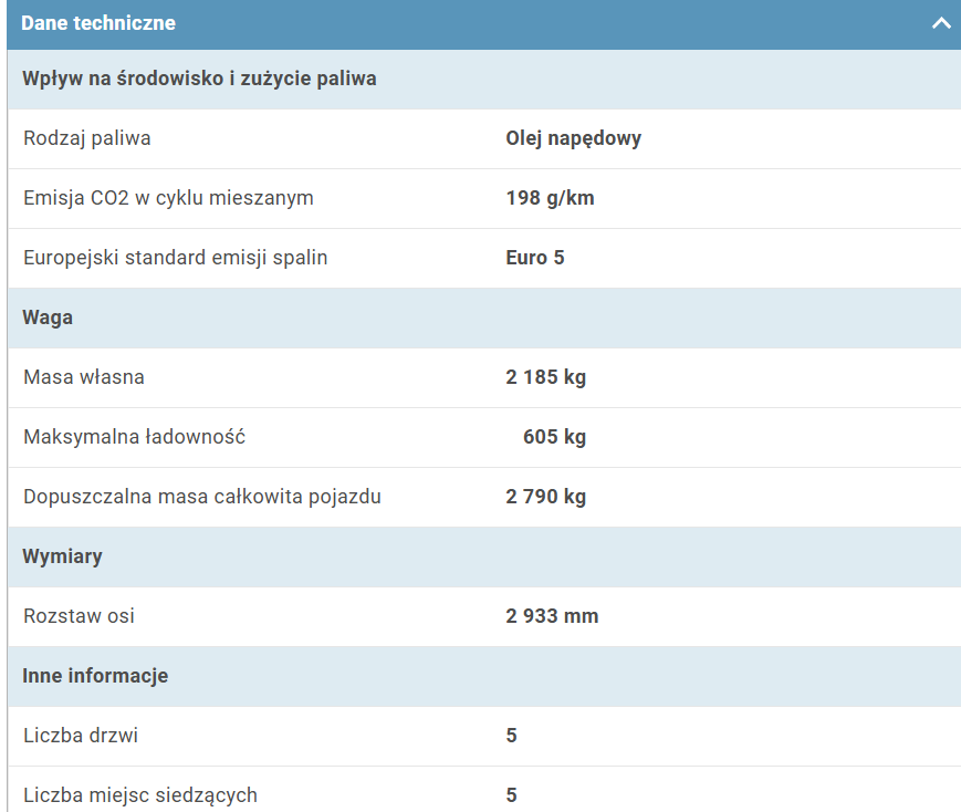 Ostatnia informacja w raporcie to dane techniczne, takie jak wpływa na środowisko, zużycie paliwa, waga, wymiary, i inne. Są to informacje ogólnodostępne.