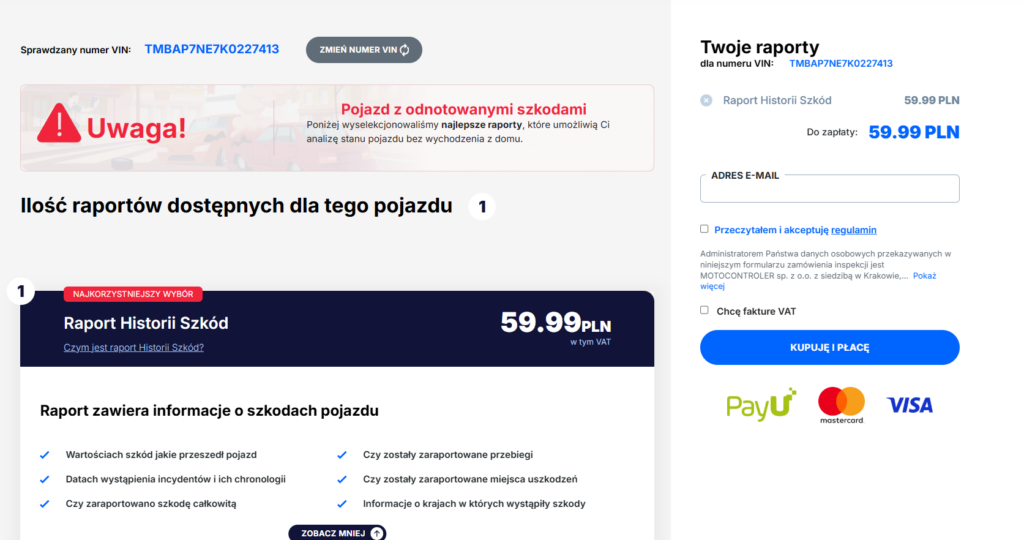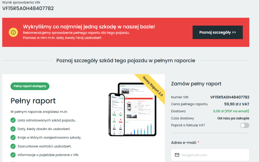 Podobnie jak w przypadku VIN Story, historiaszkod.pl również mówi jasno co otrzymasz, zanim zakupisz konkretny raport.