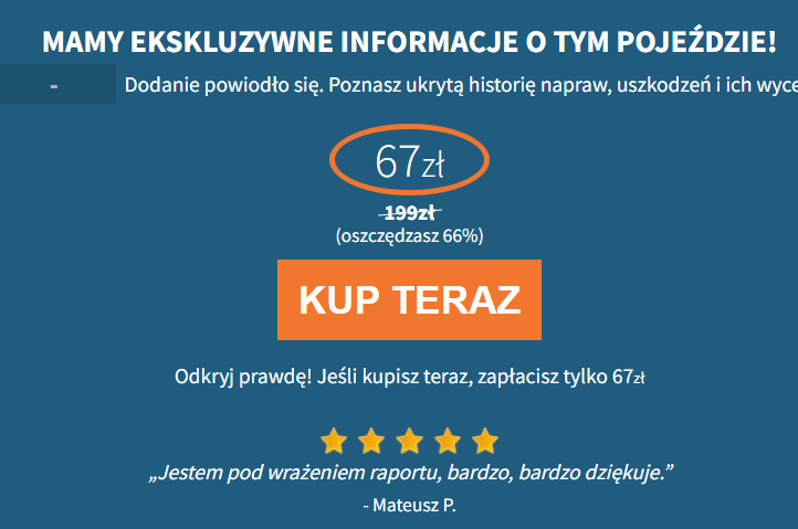 Moim zdaniem przydałoby się jednak więcej informacji, niż tylko na temat szkód pojazdu, np. o przebiegu, czy kradzieżach. Cena raportu to 59,99 zł.