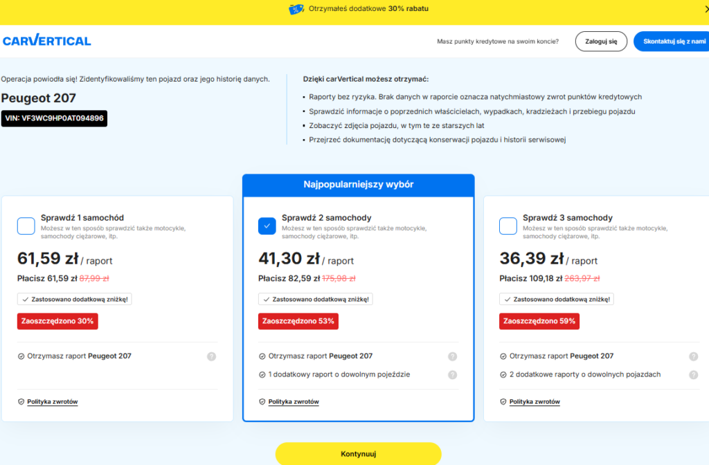 Dodatkowo carVertical oferuje atrakcyjne zniżki na zakup 2 lub 3 raportów.